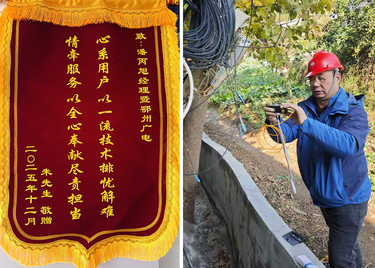 “潘站长,太感谢你了!困扰我多日的网速问题终于彻底解决了,广电的服务真是没话说!”2026年1月1日,新年第一天,鄂州市临空经济区吾悦华府小区居民朱先生专程来到湖北广电网络鄂州分公司新庙站,将一面印着“心系用户以一流技术排忧解难,情牵服务以全心奉献尽责担当”的锦旗送到潘丙旭手中,鲜红的锦旗在营业厅灯光下格外醒目,见证着一段广电人与用户的暖心故事。
